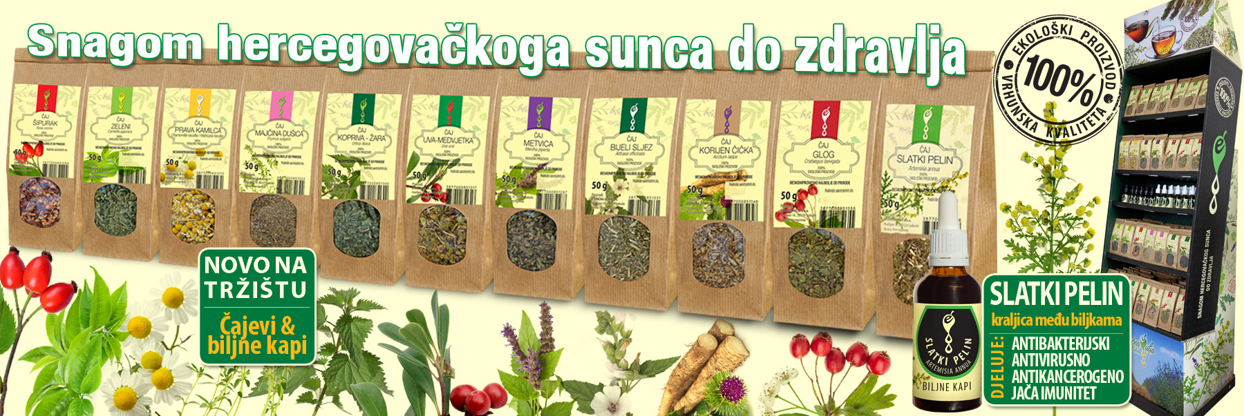 Djelotvorna ekološka eterična ulja koje proizvodimo su dobivena iz biljaka koja su autentična za hercegovačku floru. Suradnjom sa stranim partnerima i ekspertima iz ovog područja, znanstvenicima iz raznih oblasti, s fakultetima iz Hrvatske, BiH i s našim vlastitim istraživanjem smo uspjeli u Hercegovini selekcijom prvi razviti sjemena autentičnih biljaka koje daju obilat prinos i vrhunsku kvalitetu ulja, vodeći računa o ne narušavanju prirodnih procesa unutar biljke. Sjemena su uzeta iz prirodnog okoliša autentične biljke, u skladu s prirodom odgojena u sadnice i ponovno posađene na svoja prvobitna staništa. Ovakav, čisto ekološki pristup je bio odlučujući korak za cijelu našu proizvodnju.